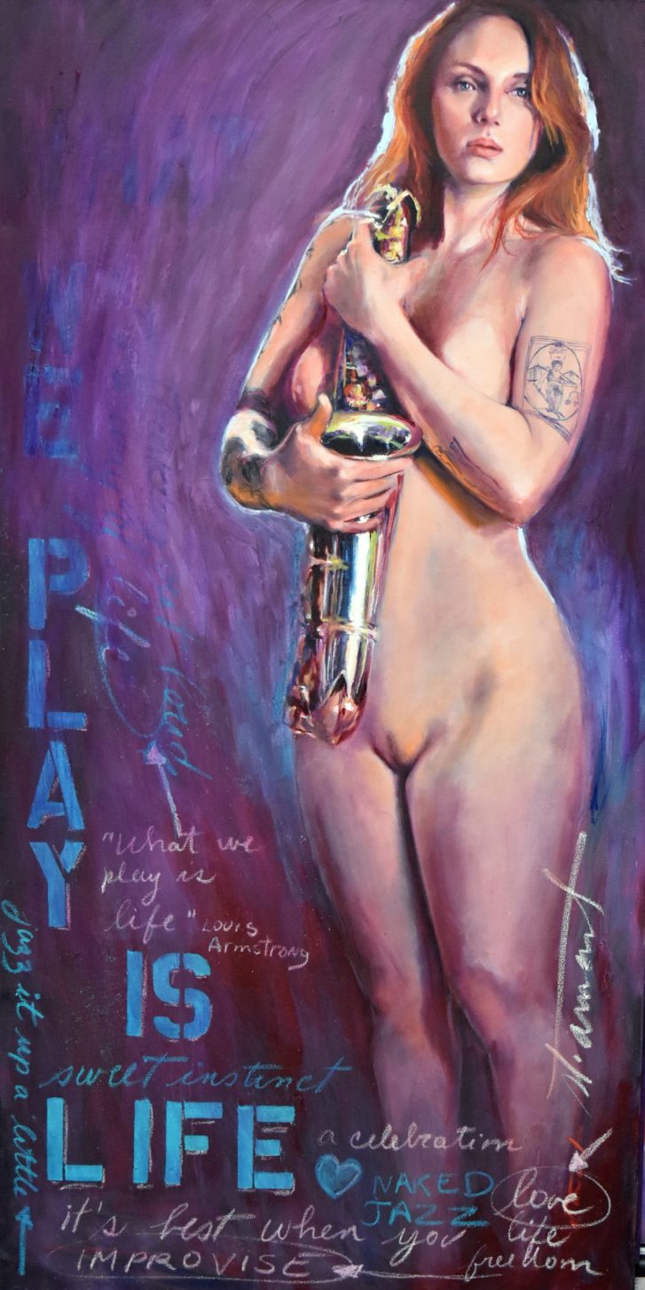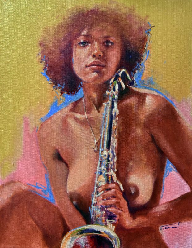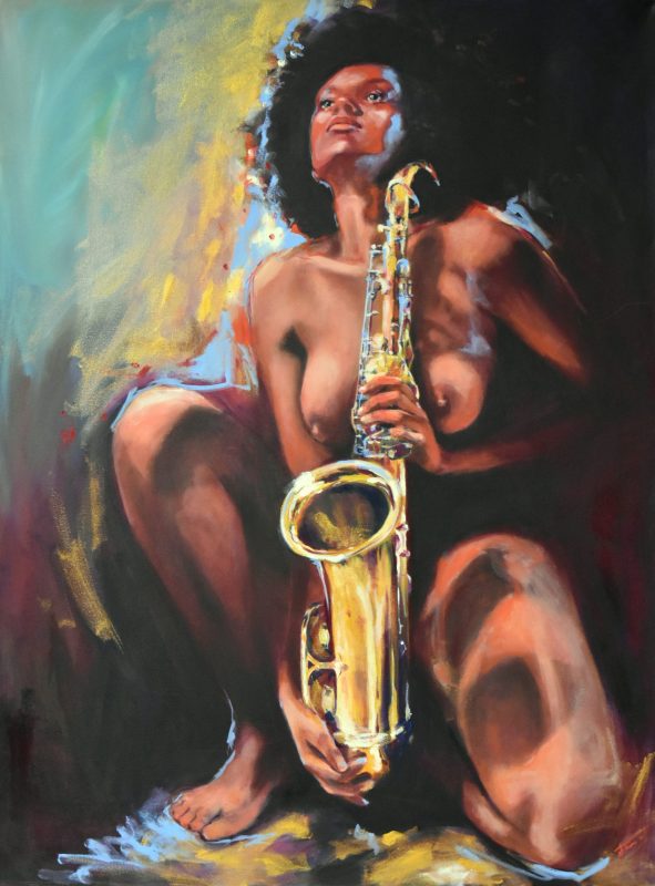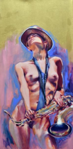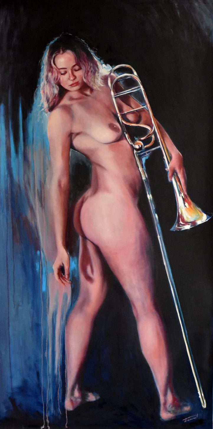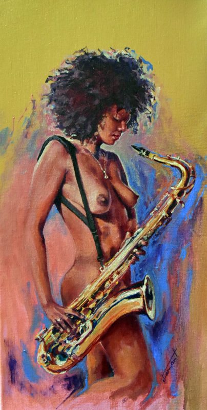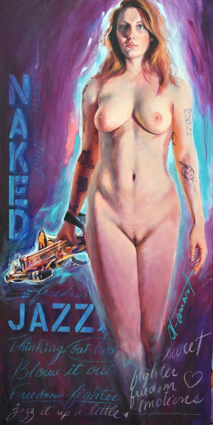 Étant une peintre académique, j’ai rapidement accordé au nu un statut privilégié dans mes œuvres. Forte de ma réalisation solo : « À Hauteur de Femme », (Immense série de trente nus, grandeur nature, réalisés au fusain) j’ai poursuivi la recherche du vrai tout naturellement dans cette voie. Ainsi est né en moi le projet : « Naked Jazz ». Représenter un corps nu n’a rien de nouveau. Plus de cent ans avant moi, « Le déjeuner sur l’herbe » (d’Édouard Monet, 1863), a produit son effet, et, aujourd’hui, m’a ouvert la porte à ce projet : « Naked Jazz ». La nudité me force à la réflexion. Je crois essayer humblement de redonner une place divine à mes modèles. Comme dans l’Antiquité, je m’applique à effacer toute forme de sexualité dans ce choix. Je nourris profondément la conviction que cette forme d’art qu’est le nu apportera le respect de la femme dans toute société. Rendre à la femme sa liberté, le libre choix de l’utilisation de son corps, voilà mon souhait! Je crois qu’il est impérieux que nous puissions voir, côtoyer et humaniser la nudité. Le respect du corps de la femme passe par son acceptation et par sa libre représentation.
