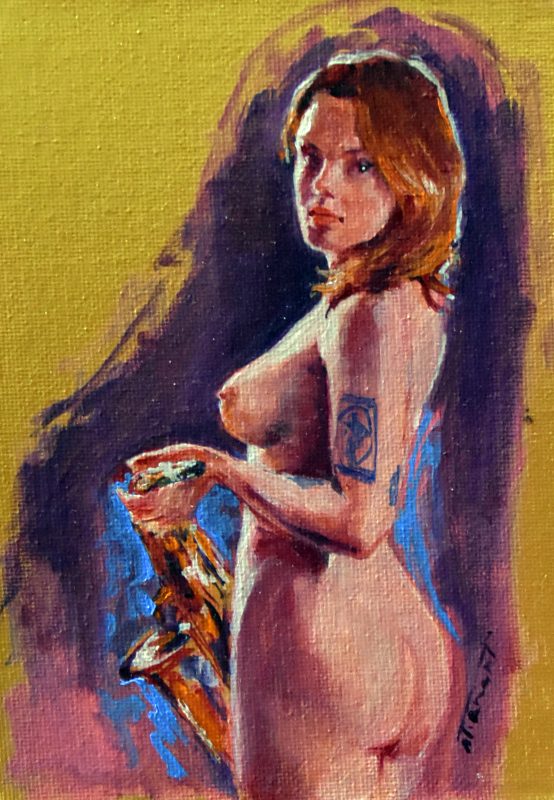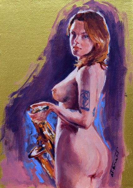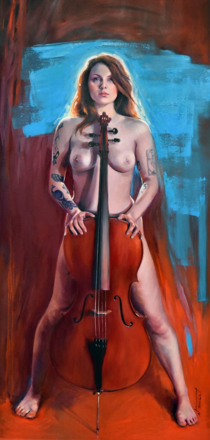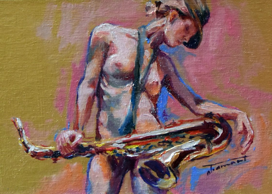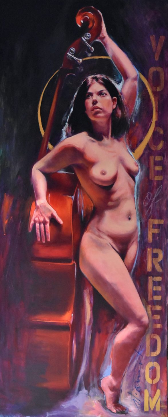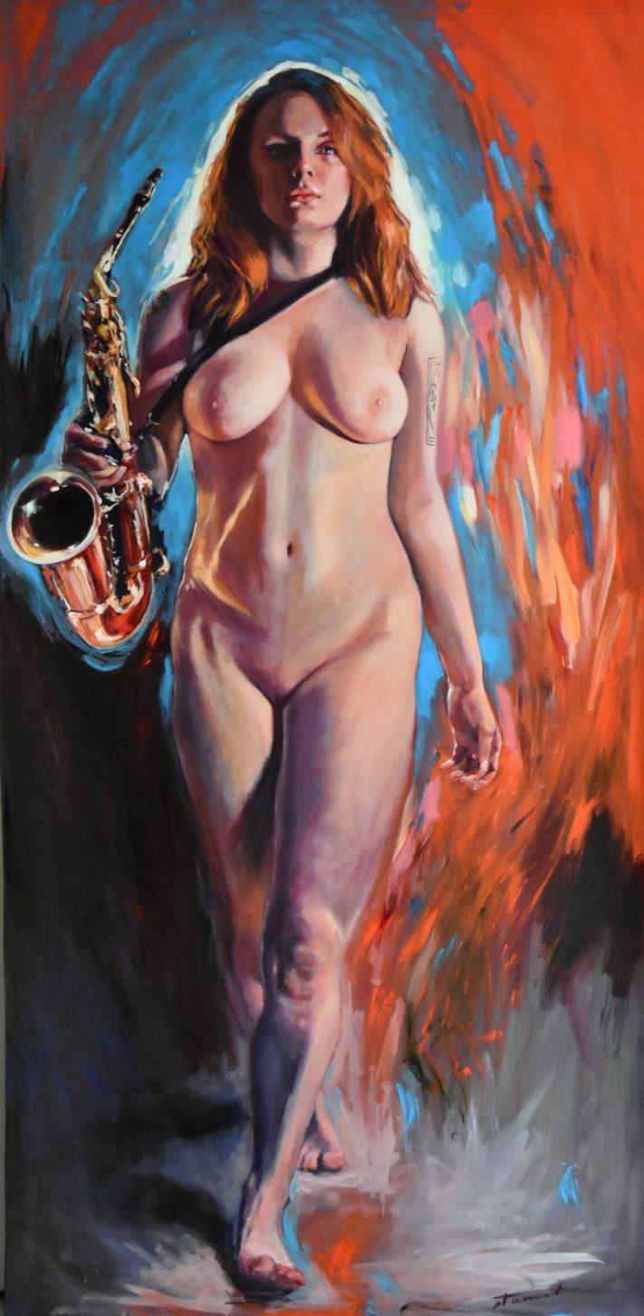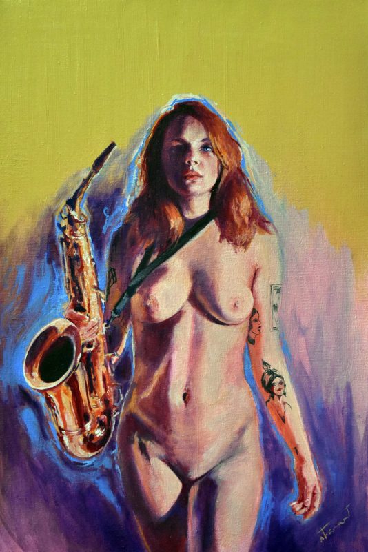 Étant une peintre académique, j’ai rapidement accordé au nu un statut privilégié dans mes œuvres. Forte de ma réalisation solo : « À Hauteur de Femme », (Immense série de trente nus, grandeur nature, réalisés au fusain) j’ai poursuivi la recherche du vrai tout naturellement dans cette voie. Ainsi est né en moi le projet : « Naked Jazz ». Représenter un corps nu n’a rien de nouveau. Plus de cent ans avant moi, « Le déjeuner sur l’herbe » (d’Édouard Monet, 1863), a produit son effet, et, aujourd’hui, m’a ouvert la porte à ce projet : « Naked Jazz ». La nudité me force à la réflexion. Je crois essayer humblement de redonner une place divine à mes modèles. Comme dans l’Antiquité, je m’applique à effacer toute forme de sexualité dans ce choix. Je nourris profondément la conviction que cette forme d’art qu’est le nu apportera le respect de la femme dans toute société. Rendre à la femme sa liberté, le libre choix de l’utilisation de son corps, voilà mon souhait! Je crois qu’il est impérieux que nous puissions voir, côtoyer et humaniser la nudité. Le respect du corps de la femme passe par son acceptation et par sa libre représentation.